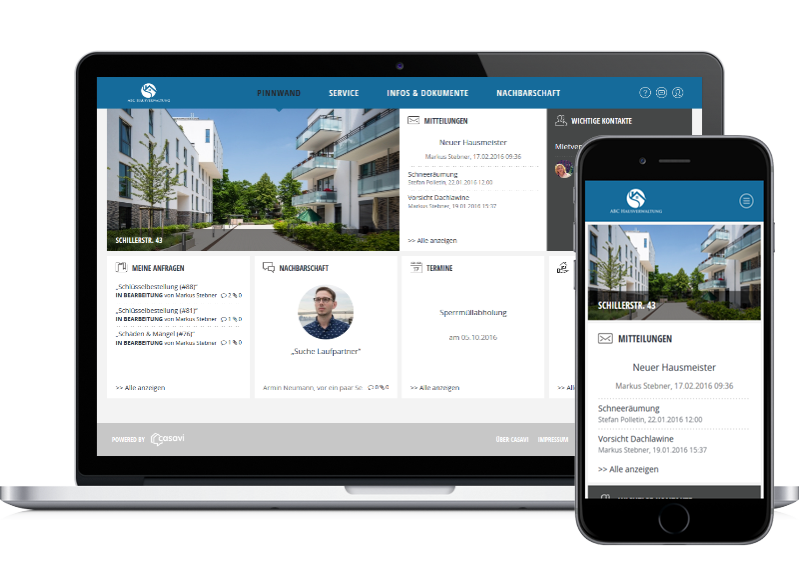 Mittels der modernen Kommunikations- und Produktivitätsplattform von casavi bieten wir einen eigenen digitalen Servicebereich an. Egal ob per Smartphone, App, Tablet oder PC: Sie haben alle wichtigen Informationen zu Ihrer Immobilie stets griffbereit und können uns auch außerhalb unserer Bürozeiten kontaktieren.